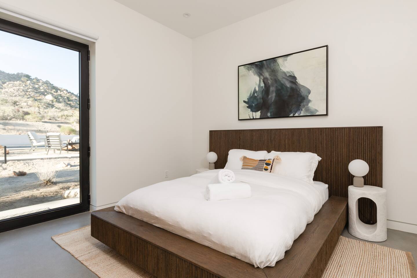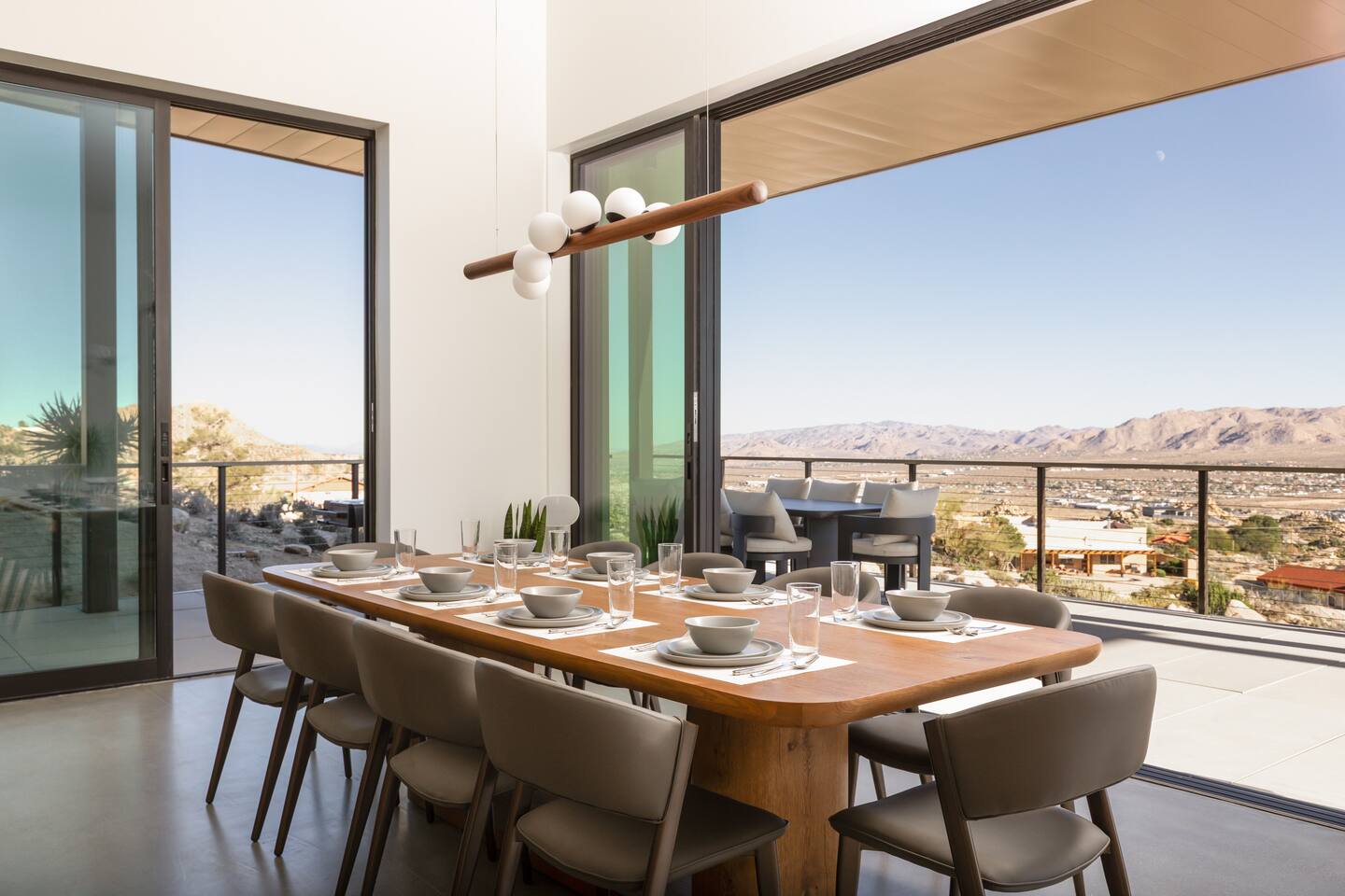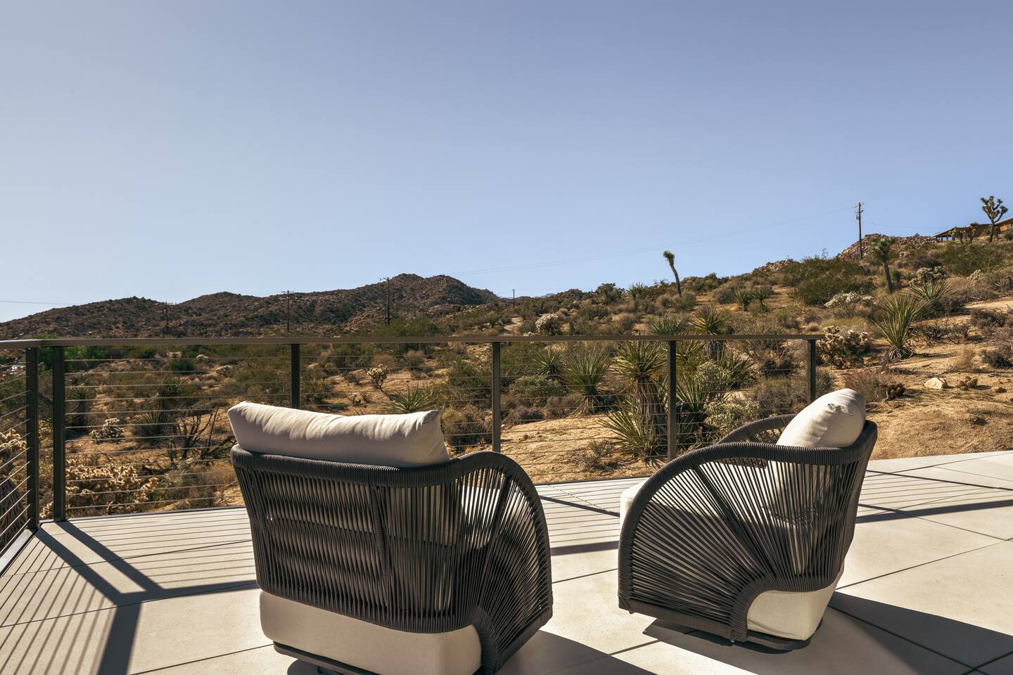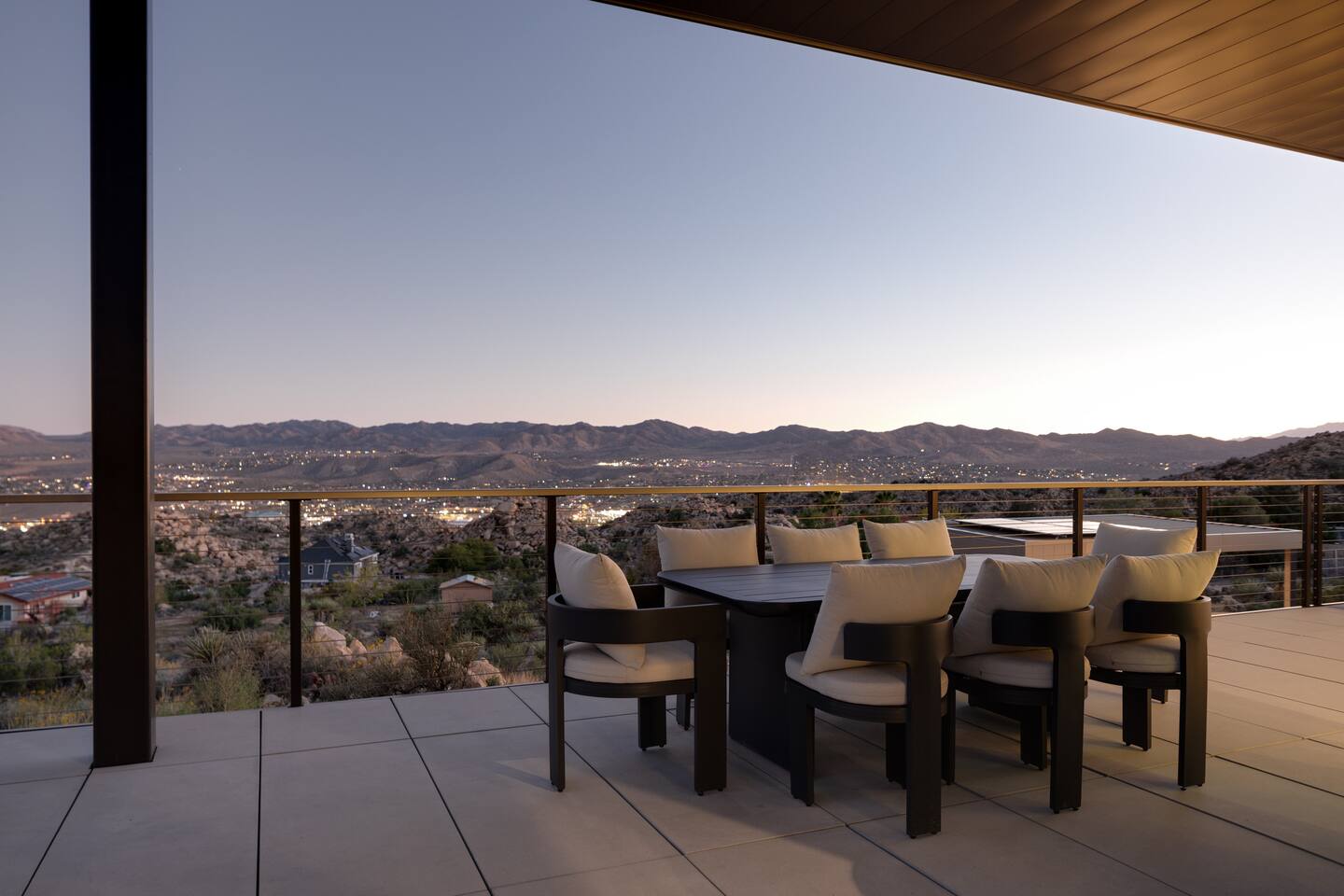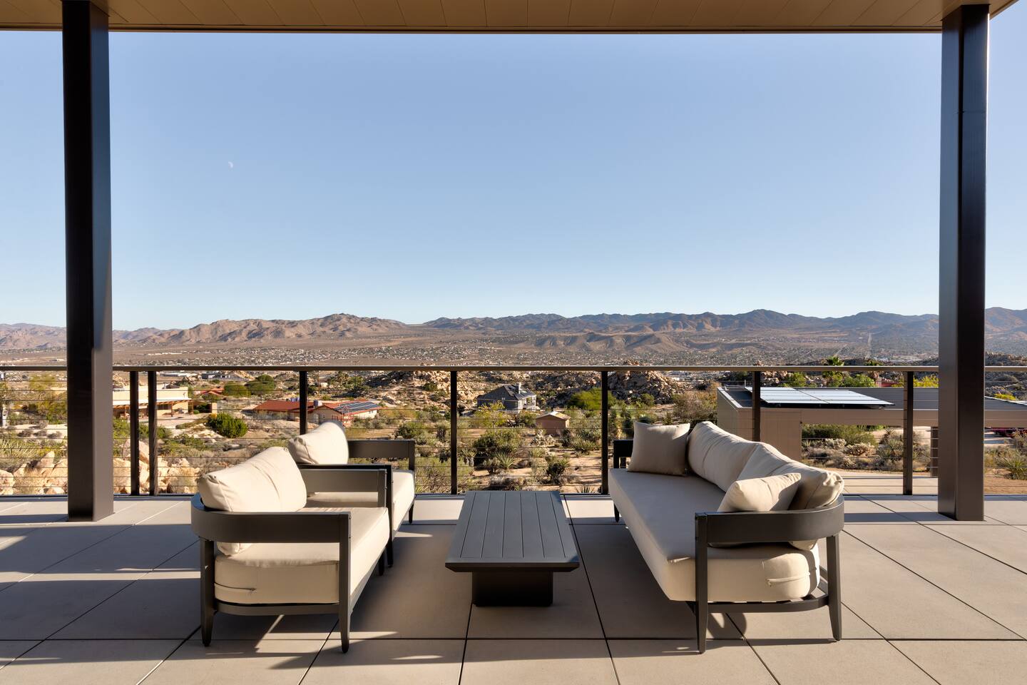 The Reserve at Boulder Ridge: A Luxury Retreat on 5 Private Acres Discover the pinnacle of desert luxury at "The Reserve at Boulder Ridge," an exclusive, architectural masterpiece perched atop a high point that overlooks the entire Morongo Basin with commanding views. From the moment you arrive on five private acres, you are greeted by panoramic views. Inside, four serene bedrooms offer ultimate comfort, including two distinct primary suites, all equipped with automated blackout shades for a perfect night's rest. This dual-suite arrangement is a true differentiator for ultimate privacy and luxury. The open-plan living area, defined by soaring 16-foot ceilings and expansive glass sliding doors, effortlessly blends the indoors and outdoors. You'll prepare gourmet meals in the fully equipped kitchen, complete with espresso machine (beans provided), and Vitamix blender. The vast glass doors open to reveal your private resort oasis in the backyard. Here, the heated saltwater pool and luxurious hot tub are dramatically framed by a giant rock pile—the perfect spot to relax on a daybed or gather around the wood burning fire pit as you watch the sunset and the roadrunners flit by. Stay connected with fast Starlink WiFi and enjoy music with the Sonos whole house sound system, all just a short, scenic drive from highlights like Joshua Tree National Park (20 min) and Pappy and Harriet's (14 min). ☀️ Key Features • Location: Perched on 5 private acres overlooking the Morongo Basin. • Architecture: New build with 16-foot ceilings and high-end finishes. • Bedrooms/Baths: 4 Bedrooms / 3 Bathrooms (with 2 King Primary Suites). • Outdoor Resort: Heated Saltwater Pool, Hot Tub, Wood Burning Fire Pit, and luxury outdoor seating/daybeds. • Dining: Chef's kitchen + BBQ on the front deck for grilling. • Comfort: Automated blackout shades in all bedrooms. • Technology: Fast Starlink WiFi (perfect for remote work) and Sonos whole house sound system. • Proximity: Less than 20 minutes to local hot spots, including Joshua Tree NP, La Copine, Pappy and Harriet's, and Integration Sound Bath.