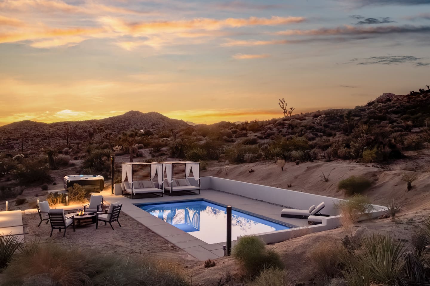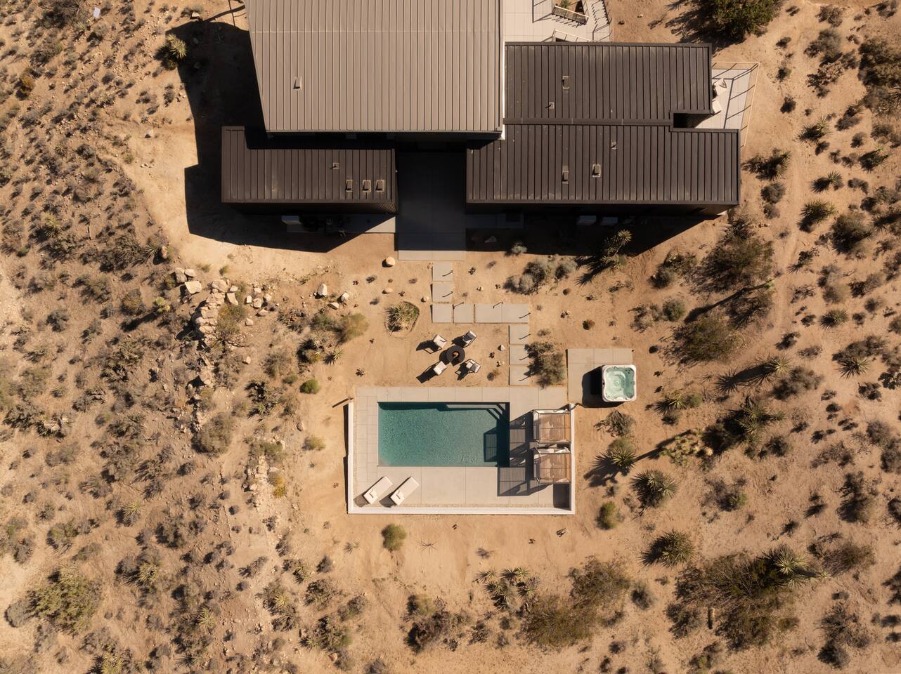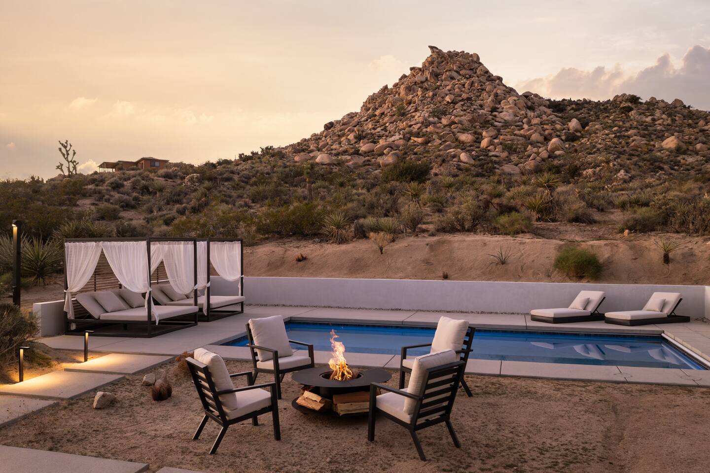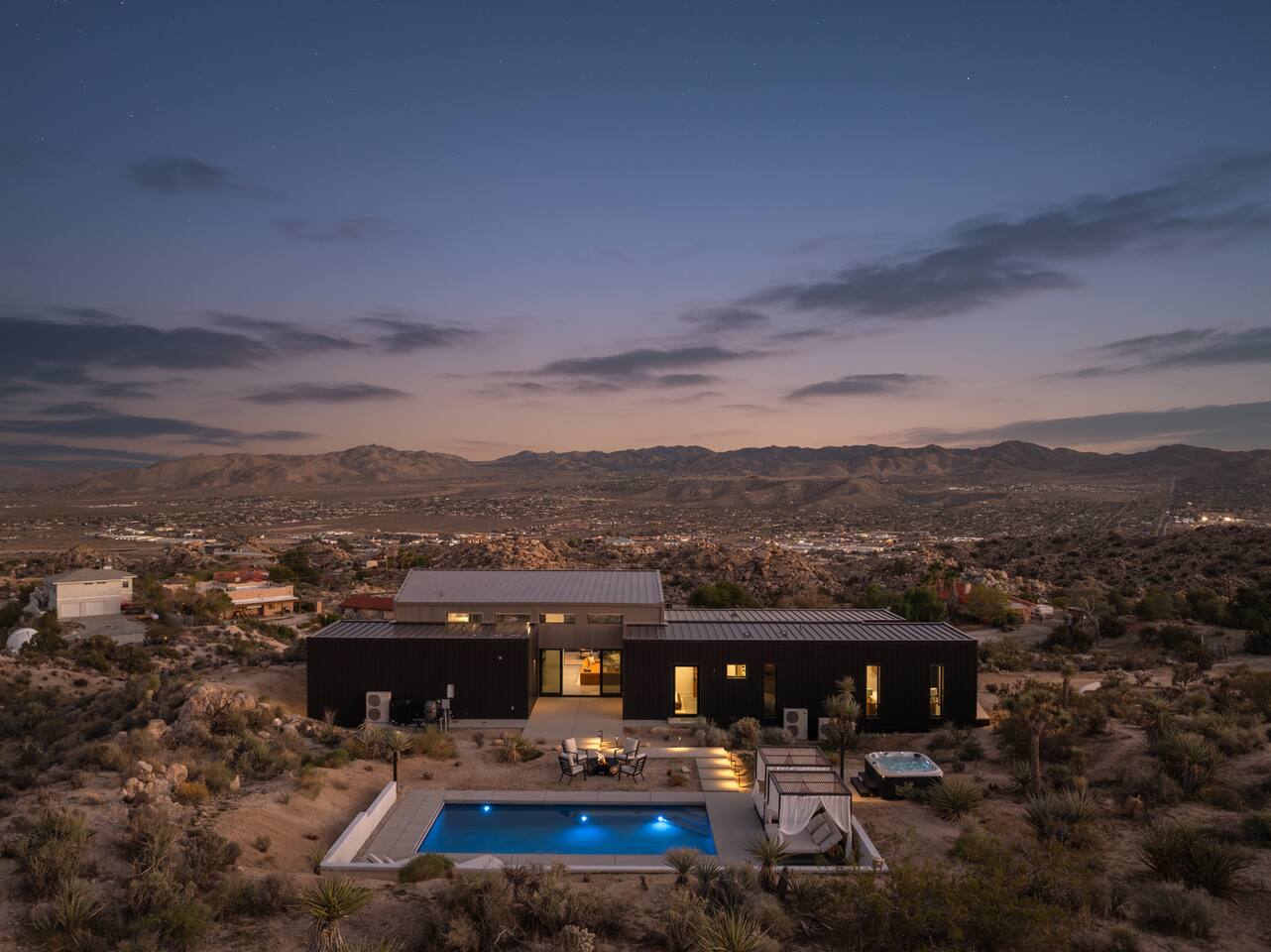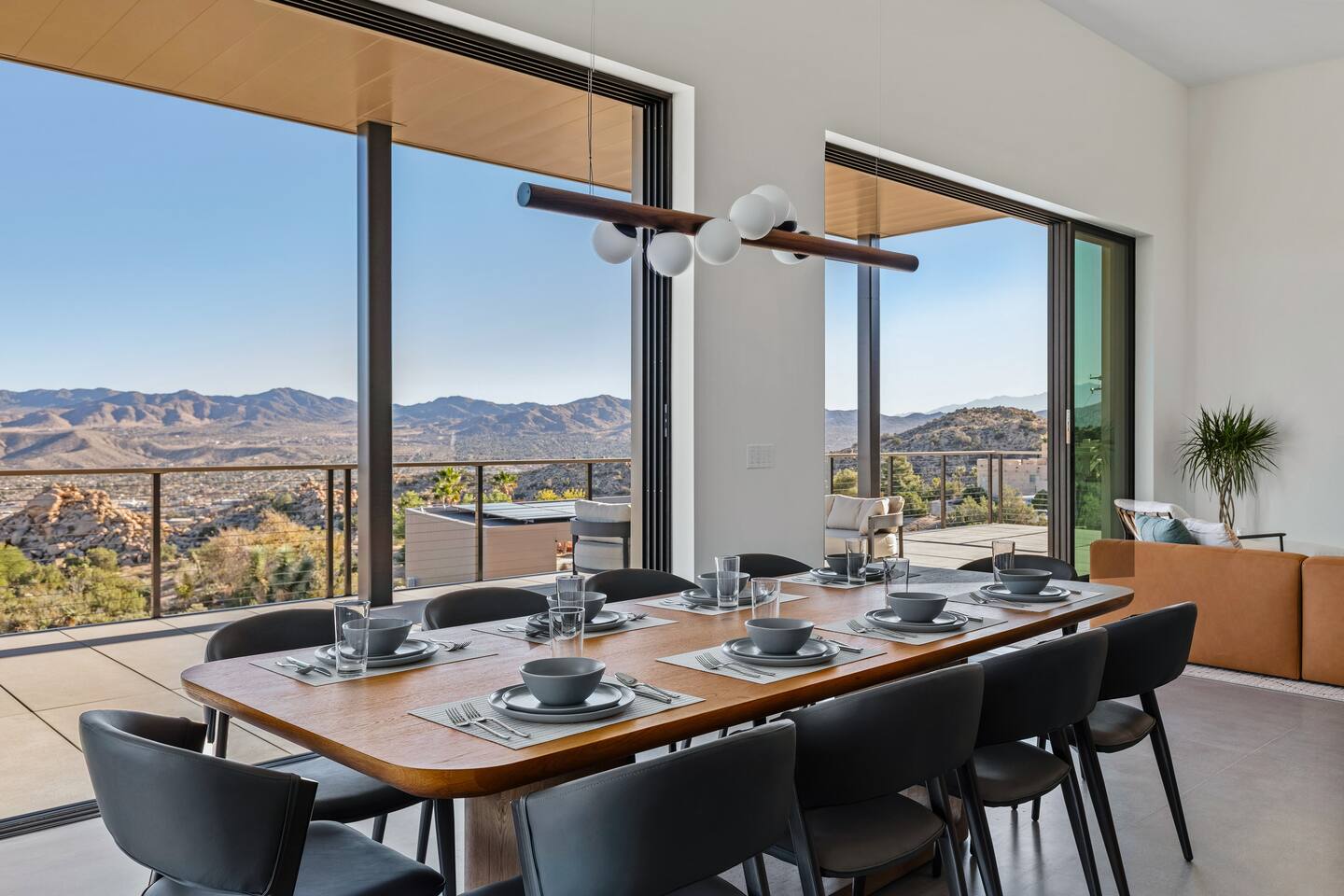 The Reserve at Boulder Ridge: A Luxury Retreat on 5 Private Acres Discover the pinnacle of desert luxury at "The Reserve at Boulder Ridge," an exclusive, architectural masterpiece perched atop a high point that overlooks the entire Morongo Basin with commanding views. From the moment you arrive on five private acres, you are greeted by panoramic views. Inside, four serene bedrooms offer ultimate comfort, including two distinct primary suites, all equipped with automated blackout shades for a perfect night's rest. This dual-suite arrangement is a true differentiator for ultimate privacy and luxury. The open-plan living area, defined by soaring 16-foot ceilings and expansive glass sliding doors, effortlessly blends the indoors and outdoors. You'll prepare gourmet meals in the fully equipped kitchen, complete with espresso machine (beans provided), and Vitamix blender. The vast glass doors open to reveal your private resort oasis in the backyard. Here, the heated saltwater pool and luxurious hot tub are dramatically framed by a giant rock pile—the perfect spot to relax on a daybed or gather around the wood burning fire pit as you watch the sunset and the roadrunners flit by. Stay connected with fast Starlink WiFi and enjoy music with the Sonos whole house sound system, all just a short, scenic drive from highlights like Joshua Tree National Park (20 min) and Pappy and Harriet's (14 min). ☀️ Key Features • Location: Perched on 5 private acres overlooking the Morongo Basin. • Architecture: New build with 16-foot ceilings and high-end finishes. • Bedrooms/Baths: 4 Bedrooms / 3 Bathrooms (with 2 King Primary Suites). • Outdoor Resort: Heated Saltwater Pool, Hot Tub, Wood Burning Fire Pit, and luxury outdoor seating/daybeds. • Dining: Chef's kitchen + BBQ on the front deck for grilling. • Comfort: Automated blackout shades in all bedrooms. • Technology: Fast Starlink WiFi (perfect for remote work) and Sonos whole house sound system. • Proximity: Less than 20 minutes to local hot spots, including Joshua Tree NP, La Copine, Pappy and Harriet's, and Integration Sound Bath.