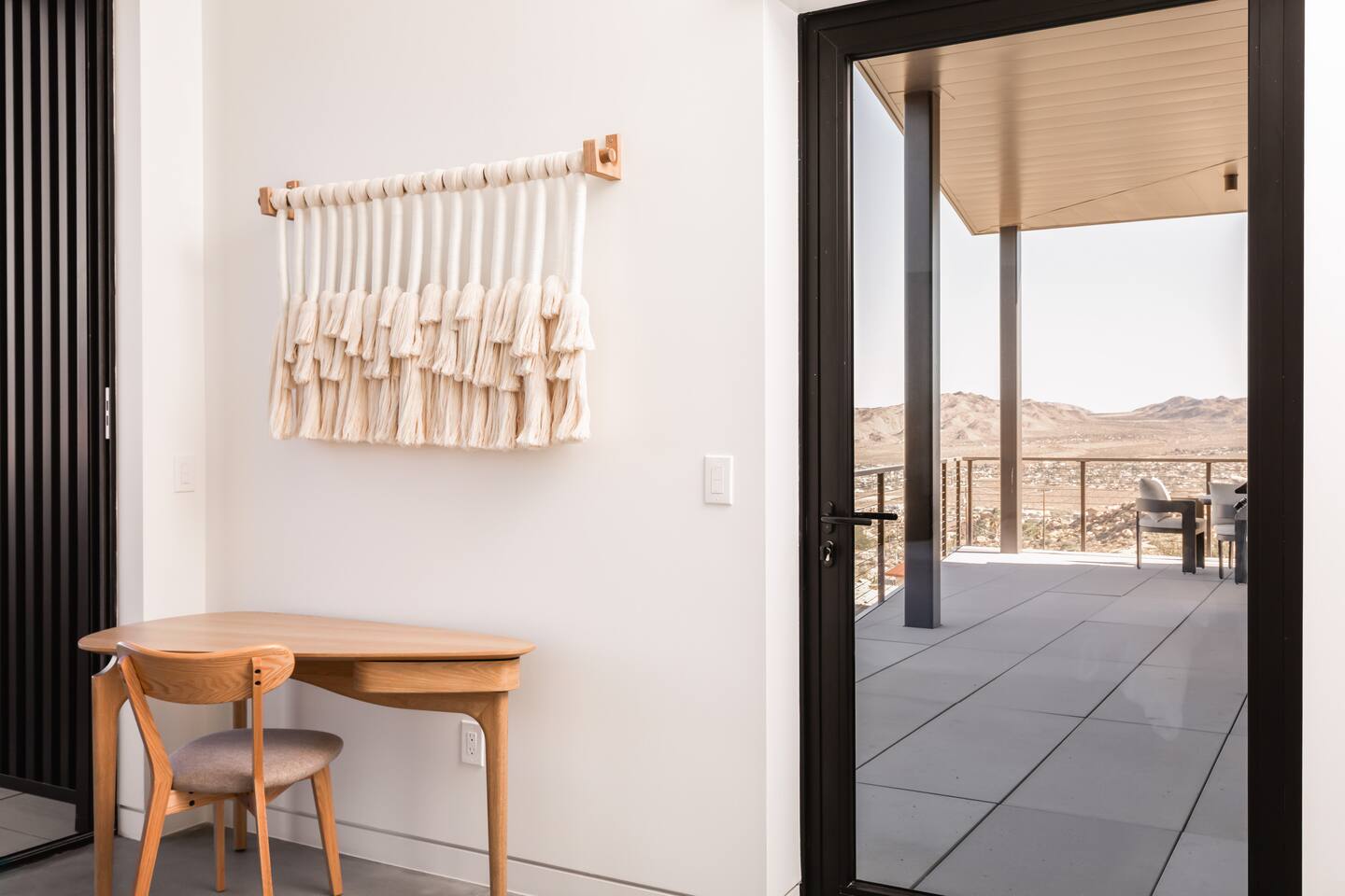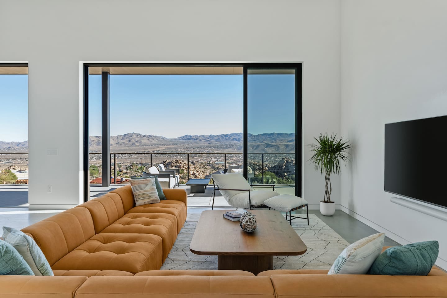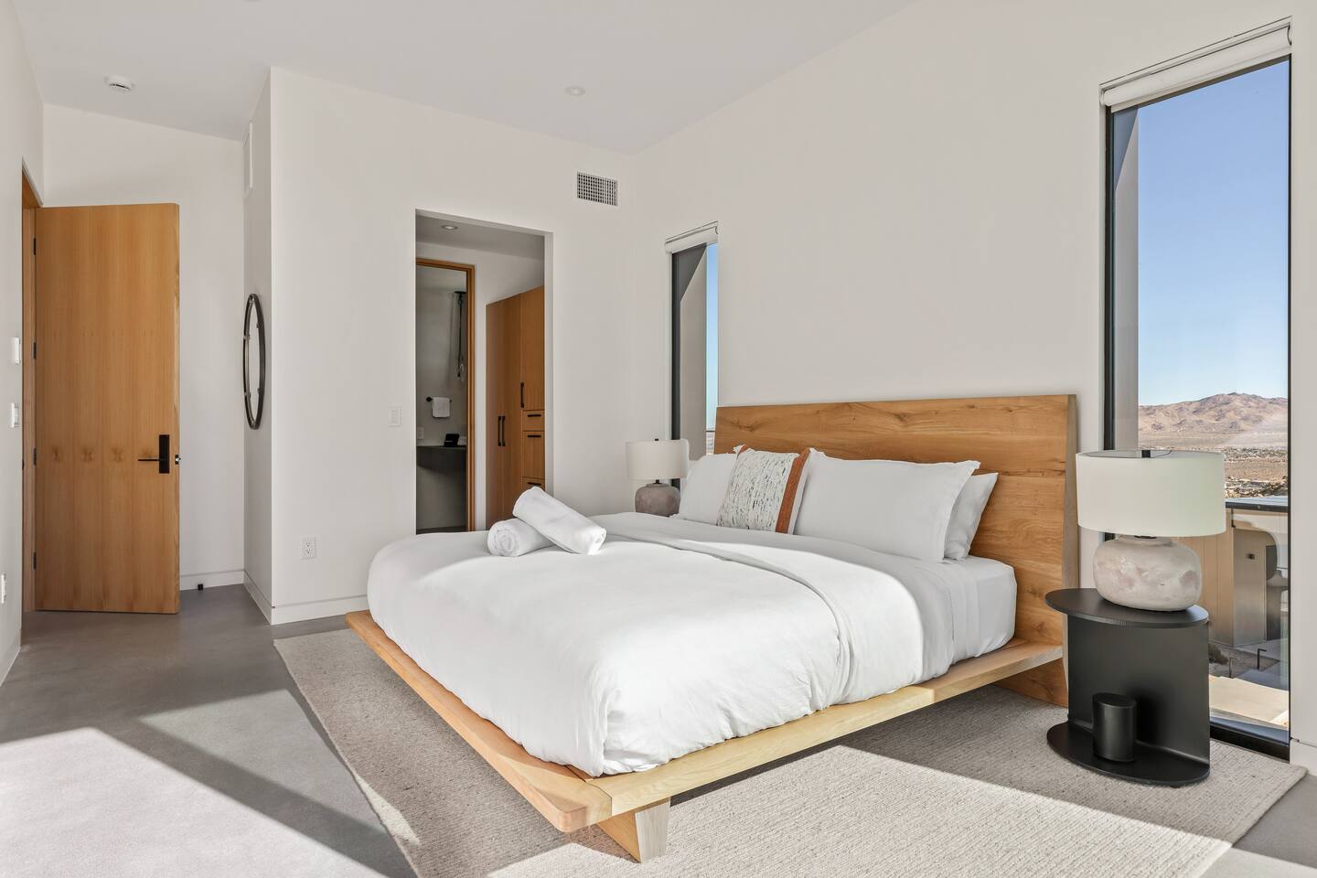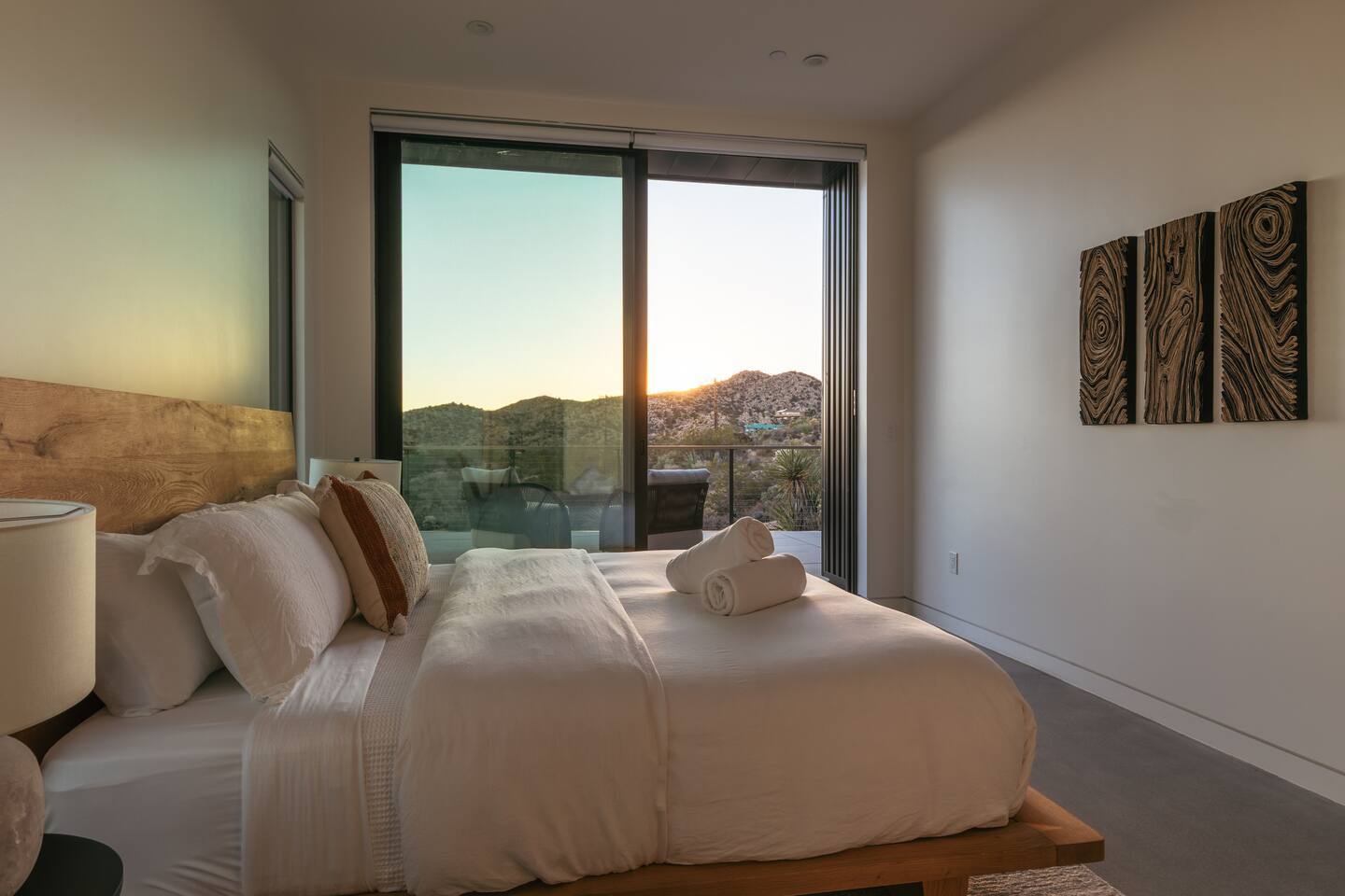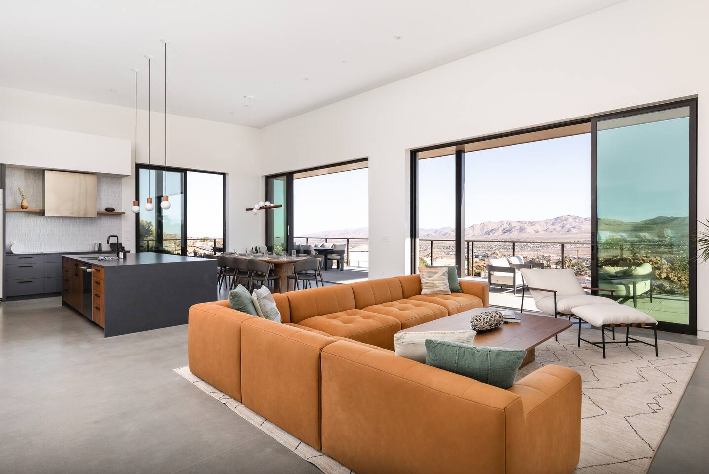 The Reserve at Boulder Ridge: A Luxury Retreat on 5 Private Acres Discover the pinnacle of desert luxury at "The Reserve at Boulder Ridge," an exclusive, architectural masterpiece perched atop a high point that overlooks the entire Morongo Basin with commanding views. From the moment you arrive on five private acres, you are greeted by panoramic views. Inside, four serene bedrooms offer ultimate comfort, including two distinct primary suites, all equipped with automated blackout shades for a perfect night's rest. This dual-suite arrangement is a true differentiator for ultimate privacy and luxury. The open-plan living area, defined by soaring 16-foot ceilings and expansive glass sliding doors, effortlessly blends the indoors and outdoors. You'll prepare gourmet meals in the fully equipped kitchen, complete with espresso machine (beans provided), and Vitamix blender. The vast glass doors open to reveal your private resort oasis in the backyard. Here, the heated saltwater pool and luxurious hot tub are dramatically framed by a giant rock pile—the perfect spot to relax on a daybed or gather around the wood burning fire pit as you watch the sunset and the roadrunners flit by. Stay connected with fast Starlink WiFi and enjoy music with the Sonos whole house sound system, all just a short, scenic drive from highlights like Joshua Tree National Park (20 min) and Pappy and Harriet's (14 min). ☀️ Key Features • Location: Perched on 5 private acres overlooking the Morongo Basin. • Architecture: New build with 16-foot ceilings and high-end finishes. • Bedrooms/Baths: 4 Bedrooms / 3 Bathrooms (with 2 King Primary Suites). • Outdoor Resort: Heated Saltwater Pool, Hot Tub, Wood Burning Fire Pit, and luxury outdoor seating/daybeds. • Dining: Chef's kitchen + BBQ on the front deck for grilling. • Comfort: Automated blackout shades in all bedrooms. • Technology: Fast Starlink WiFi (perfect for remote work) and Sonos whole house sound system. • Proximity: Less than 20 minutes to local hot spots, including Joshua Tree NP, La Copine, Pappy and Harriet's, and Integration Sound Bath.