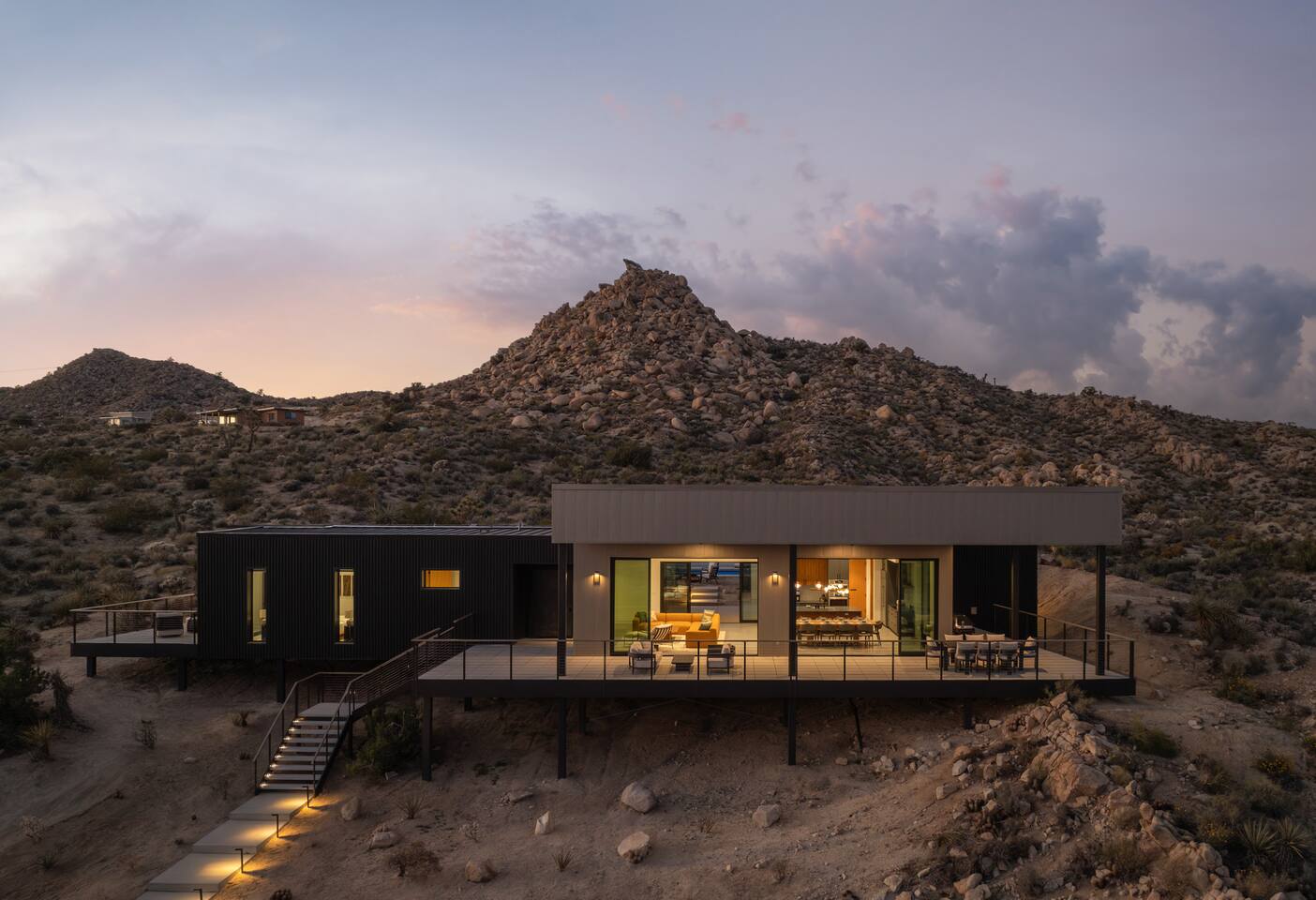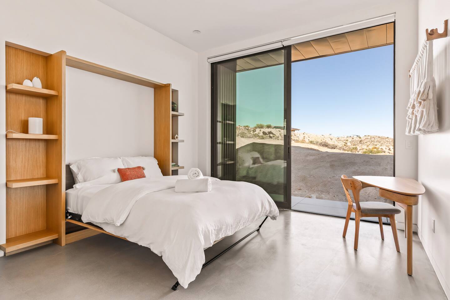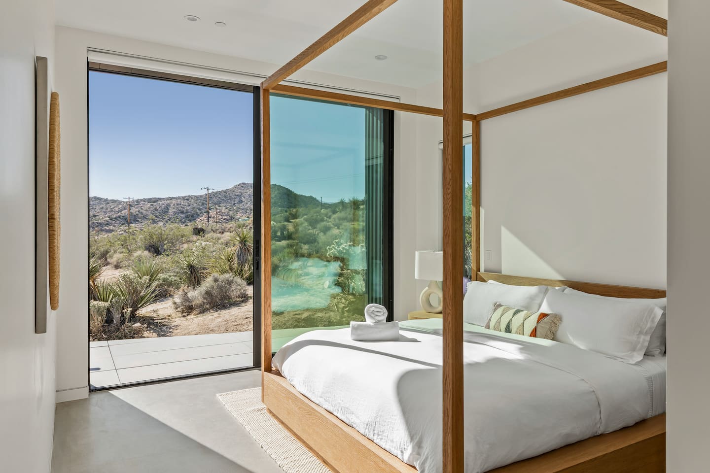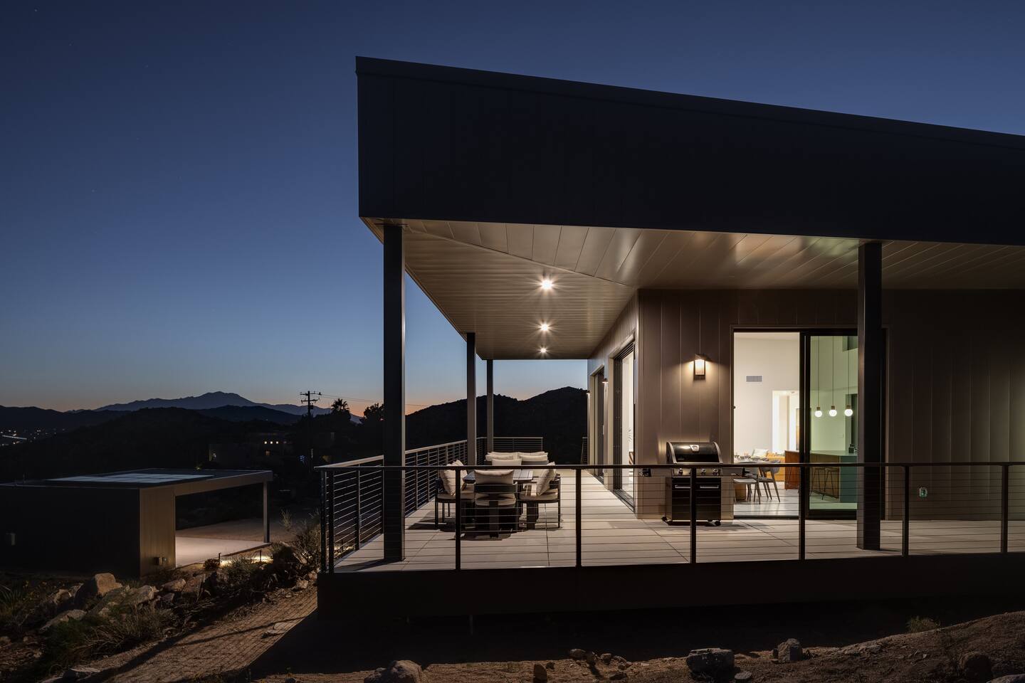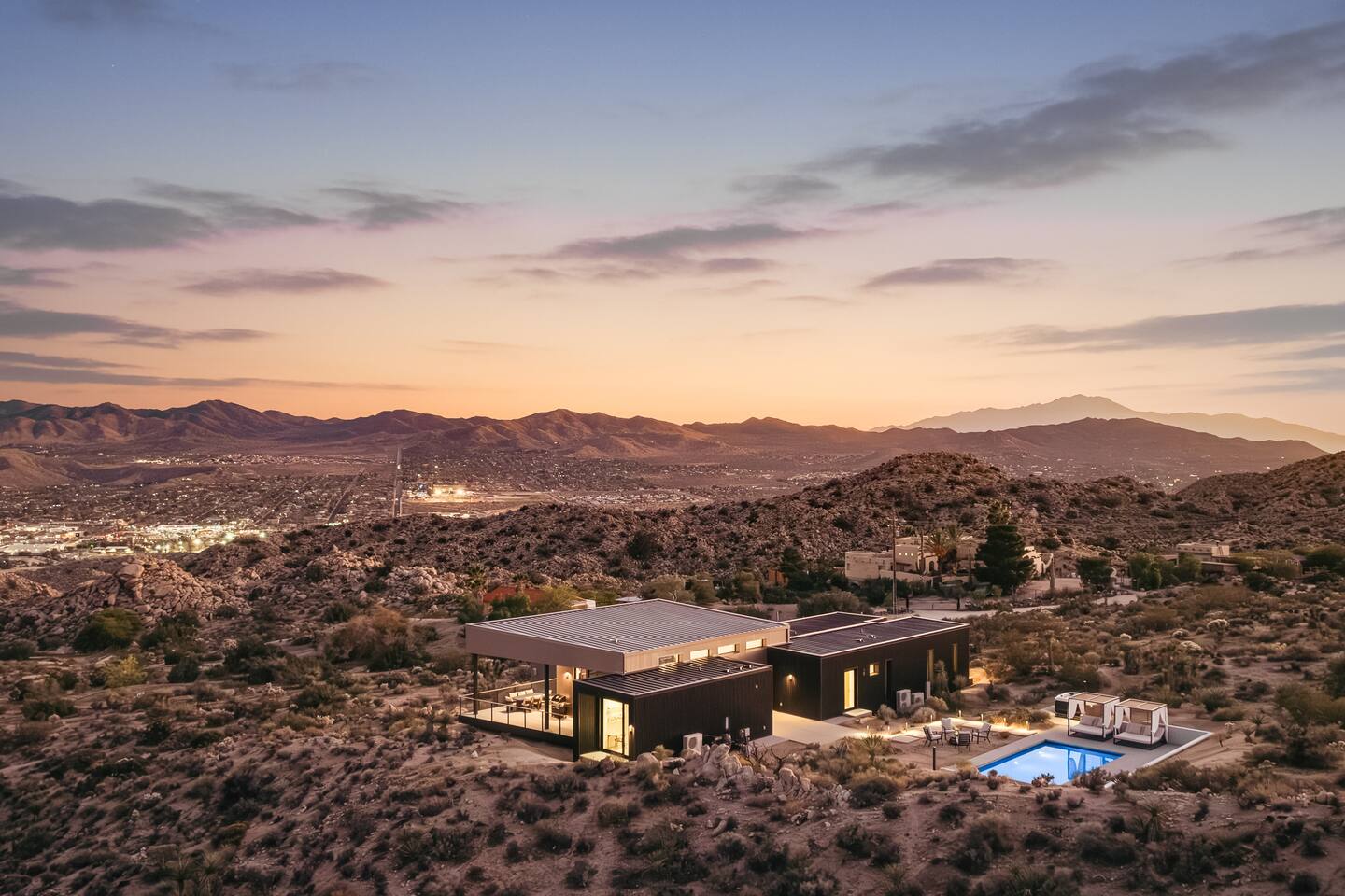 The Reserve at Boulder Ridge: A Luxury Retreat on 5 Private Acres Discover the pinnacle of desert luxury at "The Reserve at Boulder Ridge," an exclusive, architectural masterpiece perched atop a high point that overlooks the entire Morongo Basin with commanding views. From the moment you arrive on five private acres, you are greeted by panoramic views. Inside, four serene bedrooms offer ultimate comfort, including two distinct primary suites, all equipped with automated blackout shades for a perfect night's rest. This dual-suite arrangement is a true differentiator for ultimate privacy and luxury. The open-plan living area, defined by soaring 16-foot ceilings and expansive glass sliding doors, effortlessly blends the indoors and outdoors. You'll prepare gourmet meals in the fully equipped kitchen, complete with espresso machine (beans provided), and Vitamix blender. The vast glass doors open to reveal your private resort oasis in the backyard. Here, the heated saltwater pool and luxurious hot tub are dramatically framed by a giant rock pile—the perfect spot to relax on a daybed or gather around the wood burning fire pit as you watch the sunset and the roadrunners flit by. Stay connected with fast Starlink WiFi and enjoy music with the Sonos whole house sound system, all just a short, scenic drive from highlights like Joshua Tree National Park (20 min) and Pappy and Harriet's (14 min). ☀️ Key Features • Location: Perched on 5 private acres overlooking the Morongo Basin. • Architecture: New build with 16-foot ceilings and high-end finishes. • Bedrooms/Baths: 4 Bedrooms / 3 Bathrooms (with 2 King Primary Suites). • Outdoor Resort: Heated Saltwater Pool, Hot Tub, Wood Burning Fire Pit, and luxury outdoor seating/daybeds. • Dining: Chef's kitchen + BBQ on the front deck for grilling. • Comfort: Automated blackout shades in all bedrooms. • Technology: Fast Starlink WiFi (perfect for remote work) and Sonos whole house sound system. • Proximity: Less than 20 minutes to local hot spots, including Joshua Tree NP, La Copine, Pappy and Harriet's, and Integration Sound Bath.